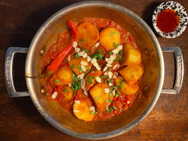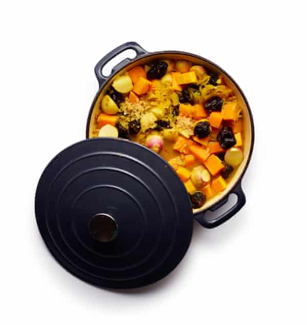 Alle, kan jeg bekræfte, er gode kandidater til tagine-behandling, selv pastinakker, selv om jeg ikke bryder mig om dem – uanset hvad du vælger, skal du dog tilstræbe en række forskellige teksturer og smagsvarianter. En vis sødme i form af squash eller søde kartofler er ofte velkommen, og jeg vil afbalancere den med den lette bitterhed og den mere robuste konsistens af majroer. Begge dele er bedst i mundrette stykker, som de fleste opskrifter anbefaler; Hart’s 5 cm store stykker er lidt uhåndterlige og tager en evighed om at blive gennemstegt. Jeg ville heller ikke gøre mig den ulejlighed at skrælle roerne, medmindre de er store.