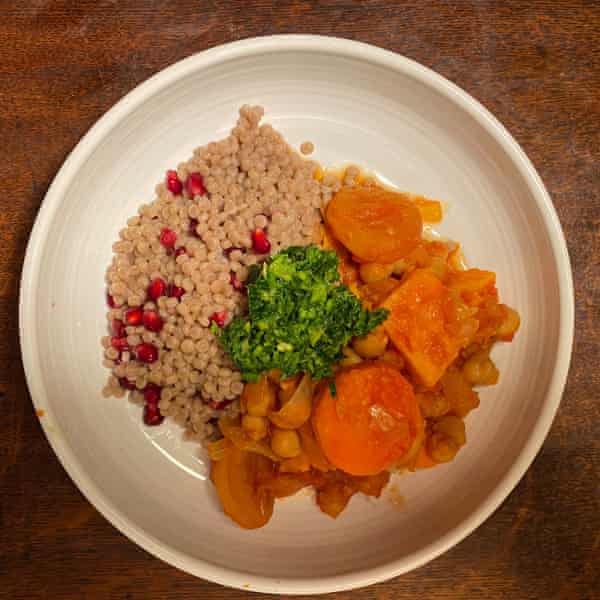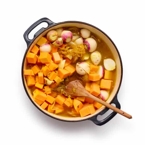 Som antydet ovenfor er dette en ret, der med glæde kan tilpasses til stort set alt, hvad du har lyst til at smide på den: Rawia Bishara har en opskrift på blomkåls-tahini-tahini-tagine i sin bog Levant, Kerstin Rogers vælger gulerod, peberfrugt og linser i V er for Vegan, Bethany Kehdy har bønner, ærter og fennikel i The Jewelled Kitchen … og så videre. Men da jeg har besluttet mig for at koncentrere mig om vintergrøntsager, prøver jeg squash i Alice Harts opskrift fra The New Vegetarian, kartoffel i en fra John Gregory-Smiths Orange Blossom & Honey, søde kartofler og gulerødder fra Anna Jones, kartoffel, pastinak, roe og knoldselleri fra Benkabbou og roe og gulerod fra Butchers bog Veggiestan.