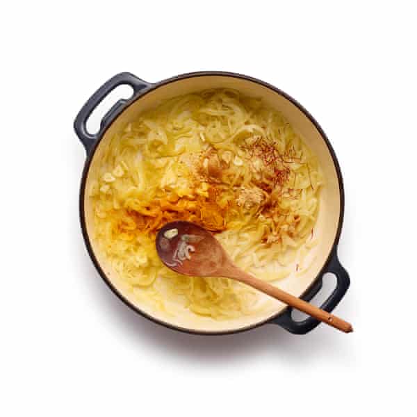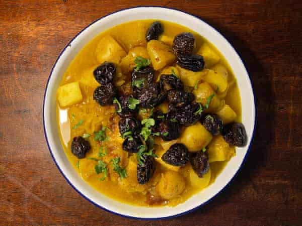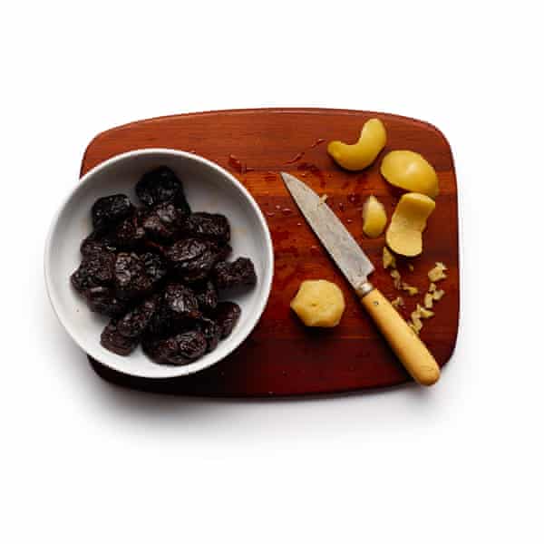 En eller anden form for løg synes at være obligatorisk i disse taginer – Butcher beholder sine skalotteløg hele, men jeg foretrækker at skære mine løg tyndt og lade dem smelte ned i saucen, hvor deres krydrede smag er yderst velkommen. Hvis du gerne vil have retten endnu sødere, kan du ligesom Gregory-Smith overveje at vælge røde løg, især hvis du vælger at undlade at bruge frugt. Jeg kan dog godt lide Butcher og Benkabbous svesker; sammen med den sædvanlige honning giver de retten en intensitet i smagen, der gør kontrasten til Harts salte syltede citroner særlig behagelig, men hvis du ikke er fan, kan du også bruge dadler eller Jones’ tørrede abrikoser.