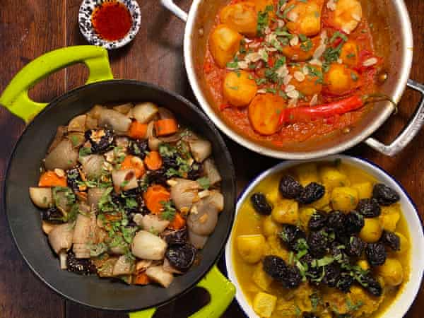 Jones laver en dejlig kraftig “urtesmash” til sin tagine, mens Gregory-Smith blander harissa, citronsaft og olie til sin tagine; begge er fremragende ledsagere. For at holde tingene mere enkle, er jeg solgt på kombinationen af Harts salte grønne oliven med søde svesker, mens hendes smørblancherede blancherede mandler giver noget tiltrængt sprødt knas. En sidste strøelse af korianderblade er ikke kun for syns skyld: den rene smag synes at løfte hele retten. Serveres med brød til at dyppe i og masser af harissa.