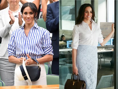Zane liebt ein knackiges Hemd mit Kragen – genau wie Markle. In Wimbledon 2018 schlüpfte Markle in ein blau-weiß gestreiftes Hemd von Ralph Lauren, das sie mit einer weißen Hose mit weitem Bein kombinierte.