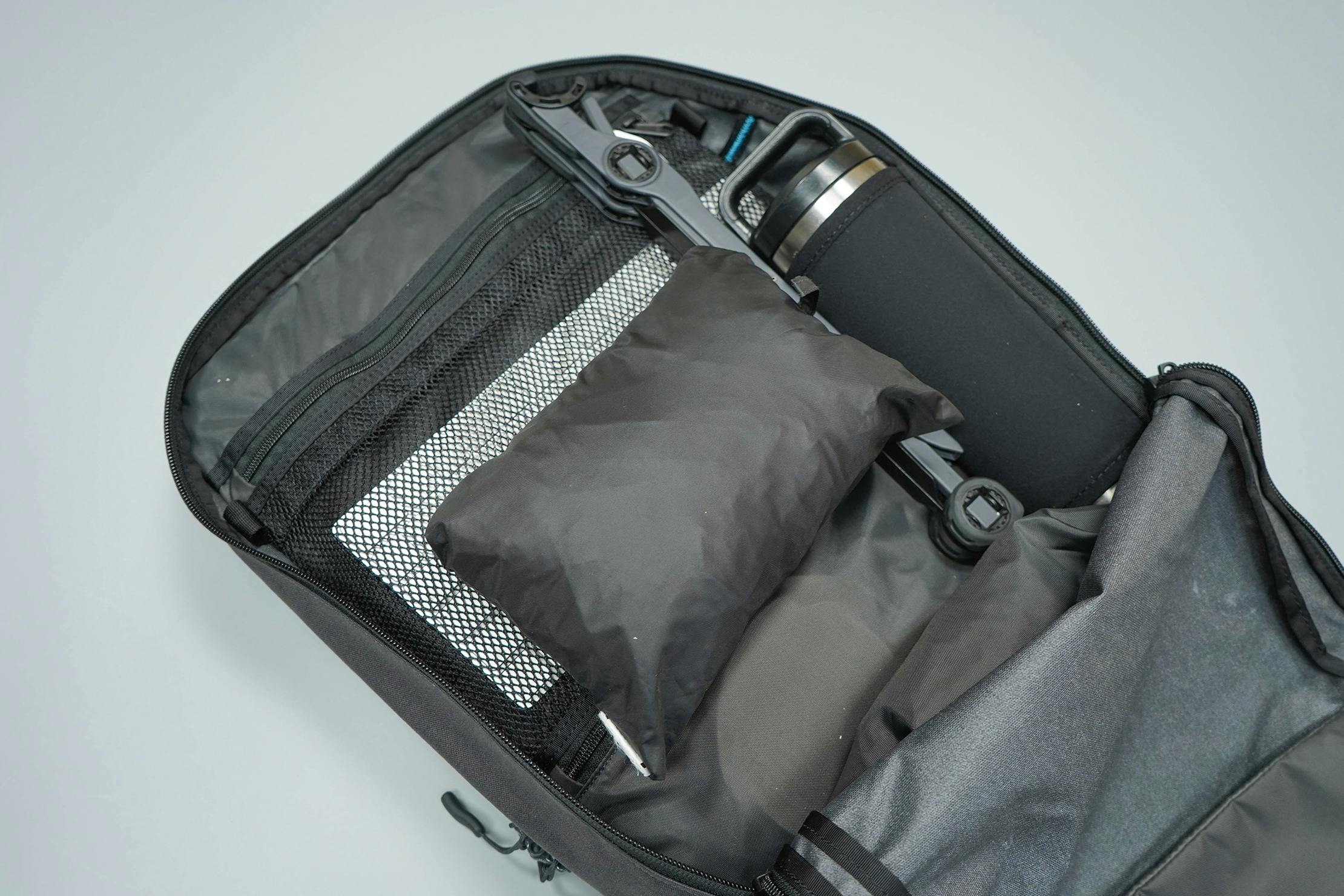 Das vordere Fach hat eine geschwungene, muschelartige Öffnung, die uns an Arc’teryx-Rucksäcke erinnert. Im Inneren befindet sich das bereits erwähnte Fach für die Wasserflasche. Eigentlich ist es mehr eine Hülle und weniger eine Tasche. Aber sie erfüllt den Zweck, eine Wasserflasche oder Thermoskanne sicher zu halten. Wir haben sie auch zum Organisieren anderer Gegenstände verwendet, insbesondere für den Roost Laptop Stand 2.0. Außerdem gibt es eine große Netztasche mit Reißverschluss und eine Nylontrenntasche darunter. Hier kannst du Kabel, Ladegeräte, Dongles oder anderen Schnickschnack aufbewahren, den du so hast.