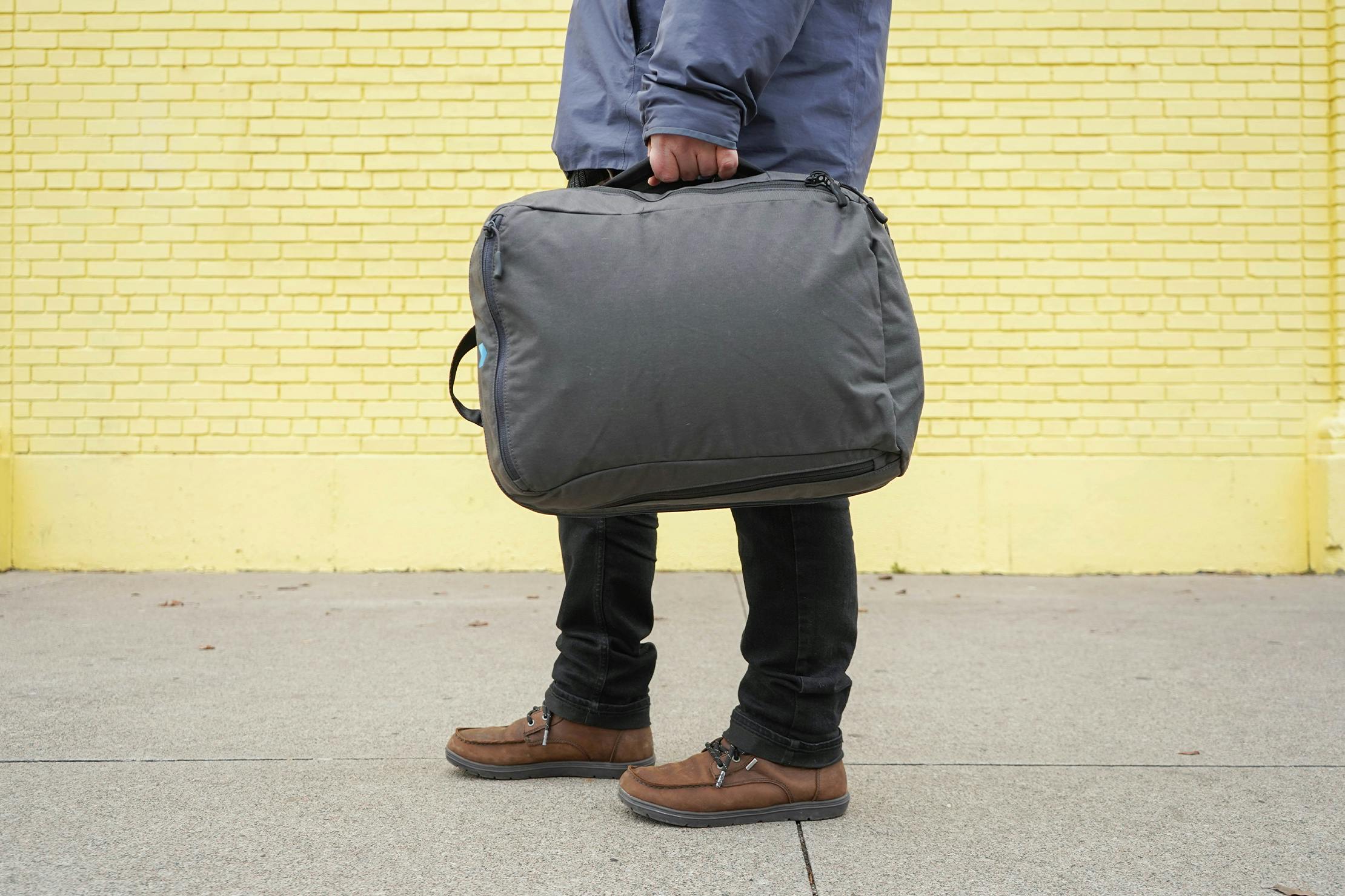 Und man muss das Ding nicht immer wie einen Rucksack tragen. Es gibt zwei Außengriffe. Der seitliche Griff ist so konzipiert, dass man die Tasche wie eine Aktentasche tragen kann. Er ist superbequem und dick. Es handelt sich hier nicht um eine der Situationen, in denen eine Marke behauptet, dass man ihren Rucksack an einem der Griffe wie eine Aktentasche tragen kann, der offensichtlich nicht dafür gedacht ist, über längere Zeit gehalten zu werden.
