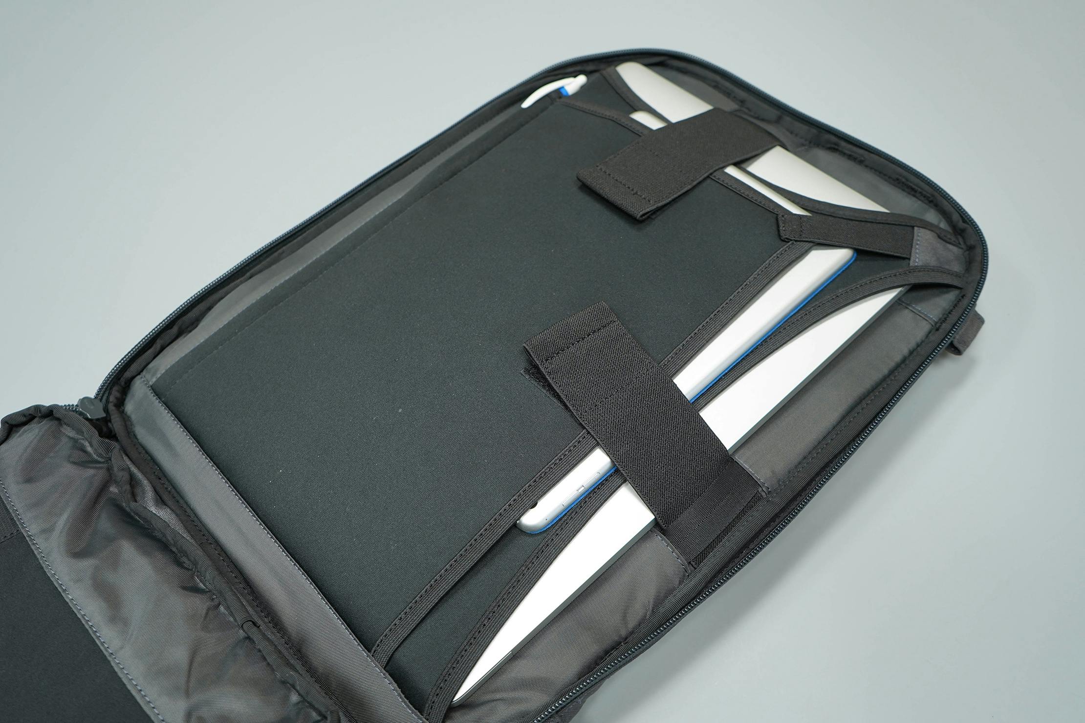 O compartimento frontal tem uma abertura curva, em estilo clamshell, que nos faz lembrar os Arc’teryx packs. Dentro, você encontrará o bolso da garrafa de água de que falamos anteriormente. Na verdade, é mais uma manga e menos um bolso. Mas faz o truque de segurar uma garrafa de água ou uma garrafa térmica com segurança. Também a usamos para organizar outros itens especificamente o suporte para laptop Roost 2.0. Há também um grande bolso com fecho de correr, um bolso de malha e um bolso divisor de nylon por baixo disso. Você pode manter cordões, carregadores, dongles, ou qualquer bugiganga aleatória que você tenha aqui.